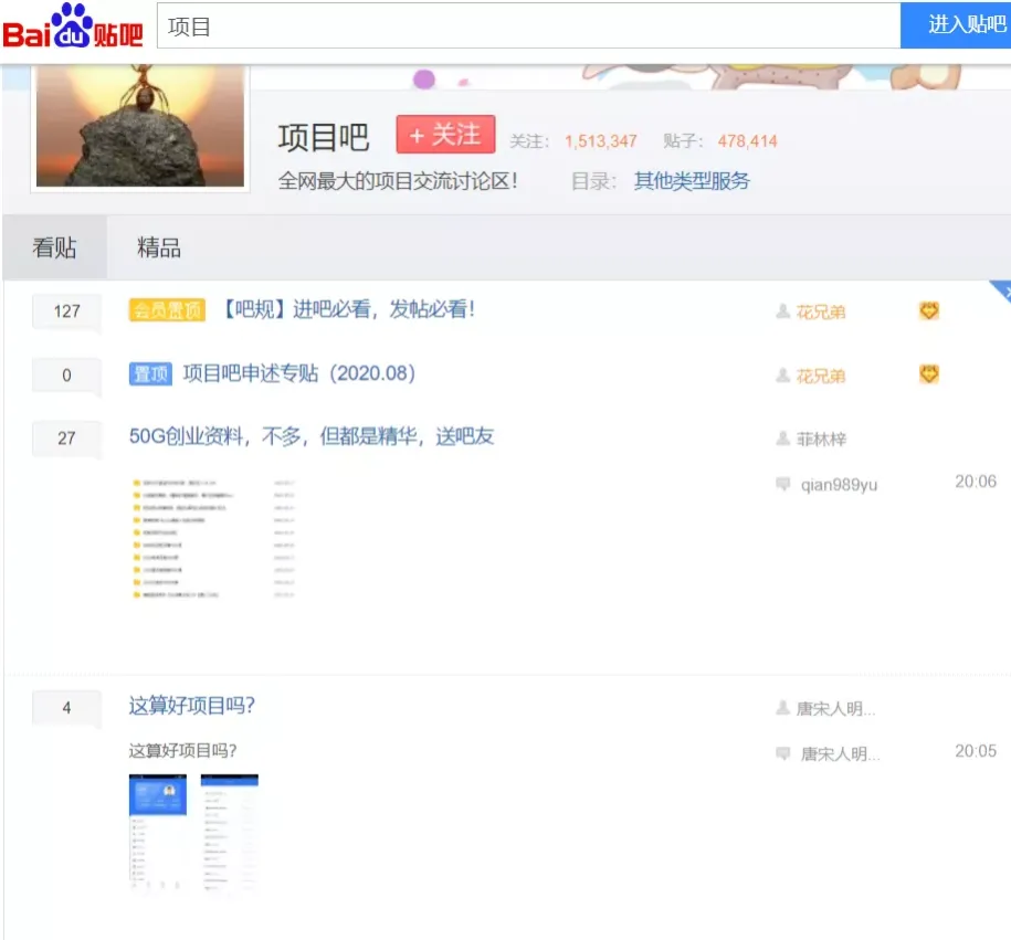马上去贴吧看一下,如下图,找了两个大流量的贴吧举例,创业吧和项目吧,实时排名前三的帖子都是卖知识付费课程的,如果不赚钱的话会花时间和金钱去24小时在竞争如此激烈的贴吧持续顶贴么?
