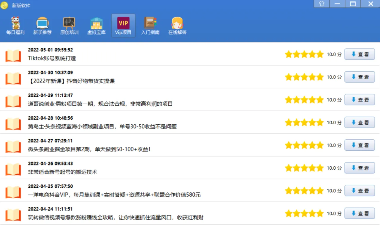软件专门开设了“VIP项目”、“原创培训”、“新手推荐”“每日赚钱”栏目,培训你网络赚钱的思路,教你自己开发网赚项目,教你如何引流变现,同时提供一些短期的操作项目,这个每天暂用时间少,有些也能赚几百,有时间的可以去做做;