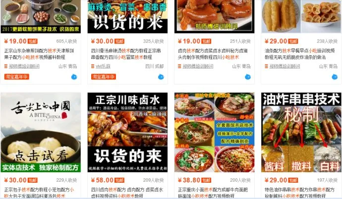 大家可以看一下这些卖小吃教程的,里面就是资料,一般都是视频+文档,看价格乘以销量(淘宝默认显示月销量),一个热门宝贝一个月进账几千块到万把块还是没啥问题的,有这么三五个爆款,小日子就很舒服了。如果有这么三百个、五百个呢?