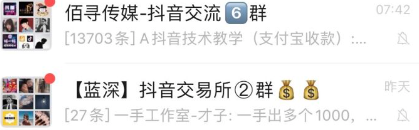 去年初抖音千粉号火爆时,我们从起号工作室收号,加价卖给个人,一天轻松100多个号,最重要的是,根本不需要到处推广,微信群里收的号,微信群里直接就出了。像这种群内部自产白销的项目其实还有很多的。